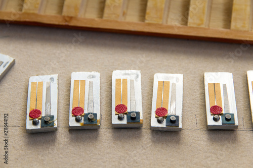 © Siur, Naklejka premium Juego de lengüetas de una acordeón desmontado en proceso de restauracion y reparacion
