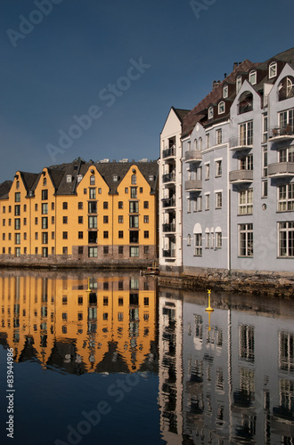 Obraz premium Jugend buildings in Alesund, Norway, reflected in beautiful calm sea. Vertical.