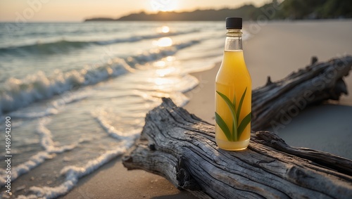 Obraz premium Juice bottle on driftwood at sunset near ocean waves