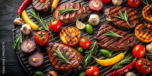 Naklejka premium Juicy grilled meat and vegetables over charcoal , BBQ, cooking, barbecue, grilling, food, summer, outdoor, delicious, smoky
