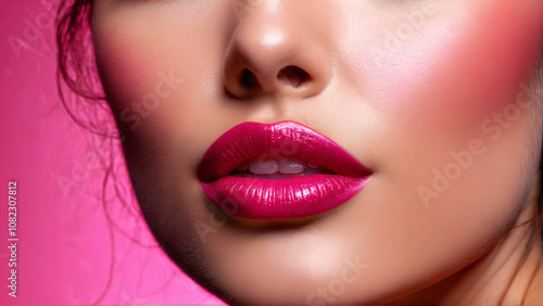 © panophotograph, Fototapeta premium Juicy lipped woman with plumping lip gloss voluminous shine hydrating swirls blurred raspberry backdrop