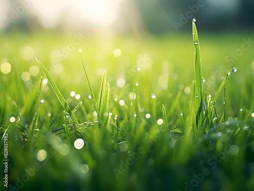 Fototapeta premium Juicy lush green grass on meadow with drops of water dew in morning light in...