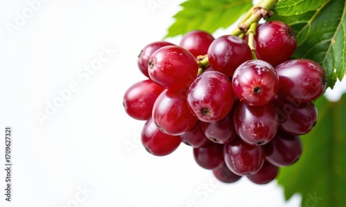 © Katherina, Fototapeta premium Juicy ripe red grape with fresh green leaves isolated on white background, isolated, organic