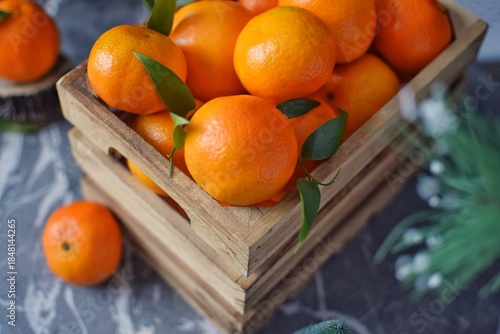 Obraz premium Juicy tangerines or clementines in a wooden box