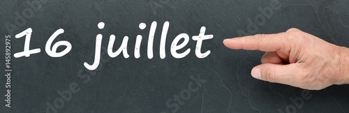 Obraz premium 16 juillet à la craie et montrer du doigt sur ardoise