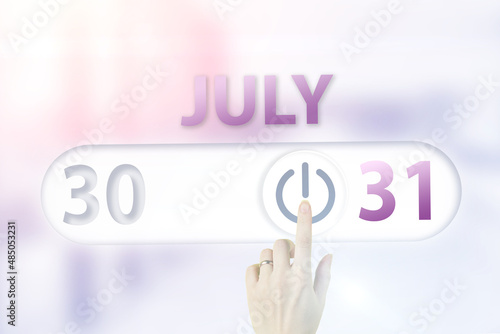 Fototapeta premium July 31st . Day 31 of month, Calendar date.Hand finger switches pointing...