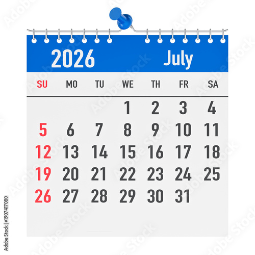 Fototapeta premium July 2026 wall calendar page with spiral binding and pin, 3D rendering
