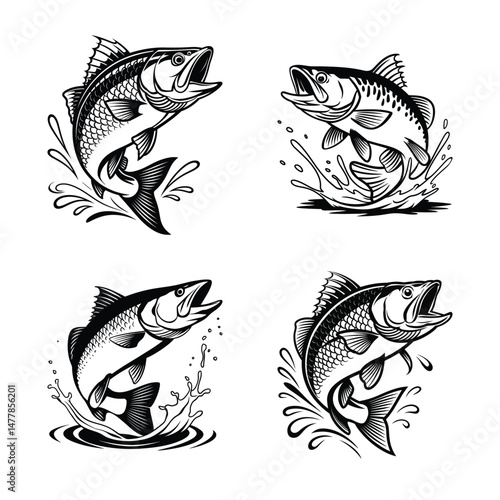 © Printora Lab, Fototapeta premium Jumping Bass Fish Black and White Vector Illustration