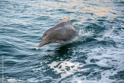 Naklejka premium jumping bottle nose dolphins in the idian ocean, enjoying to race with a boat