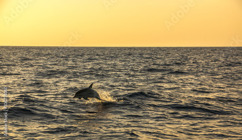 © lucadebenedetti, Fototapeta premium Jumping dolhpin during sunset