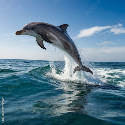 Naklejka premium Jumping dolphin, blue sea and sky