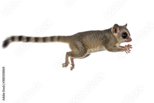 Obraz premium Jumping Ringtail Lemur with Striped Tail on White Background