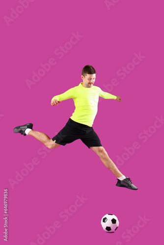 Fototapeta premium Jumping soccer player on magenta background