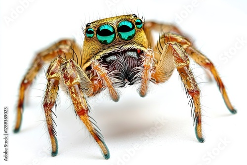 Fototapeta premium Jumping spider demonstrating intricate details and vibrant colors against a pure white backdrop