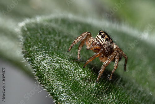 Fototapeta premium Jumping Spider Exploring Textured Leaf Surface