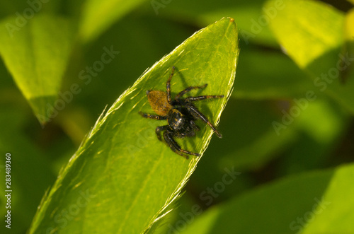 © Hakgoo, Fototapeta premium jumping spider on the green leaf