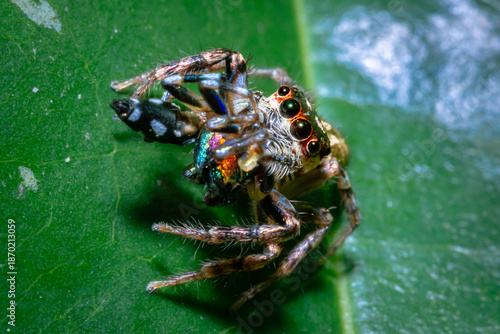 Fototapeta premium Jumping spider perched on a fresh leaf