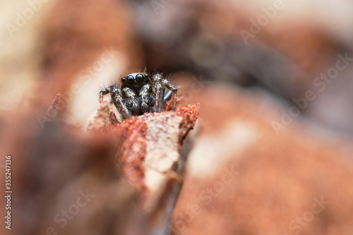 Obraz premium Jumping spider Salticus zebraneus on bark. Macro photography. Czech Republic,...