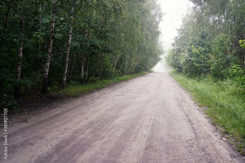 Fototapeta premium June dawn, misty landscape, empty road among trees