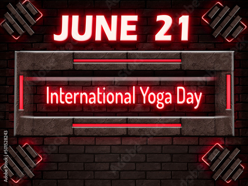 Fototapeta premium 21 June, International Yoga Day, Neon Text Effect on bricks Background
