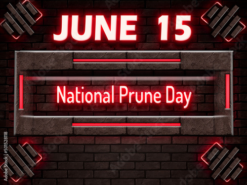 Fototapeta premium 15 June, National Prune Day, Neon Text Effect on bricks Background