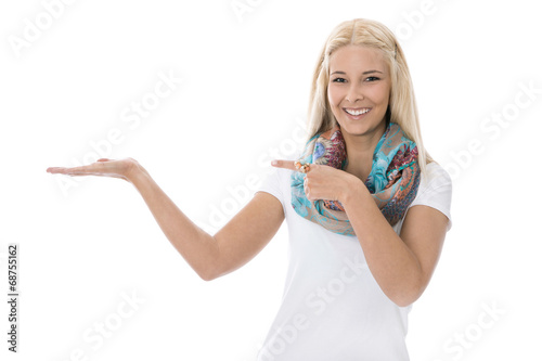 © Lifeisbeautiful, Obraz premium Junge blonde Frau präsentiert ein Produkt