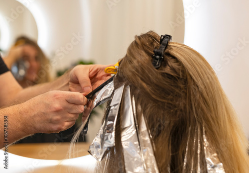 Fototapeta premium Junge Frau erhält beim Friseur Strähnchen