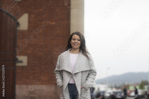 © SundGo, Fototapeta premium Junge Frau gehend an einem alten Gebäude aus Backstein