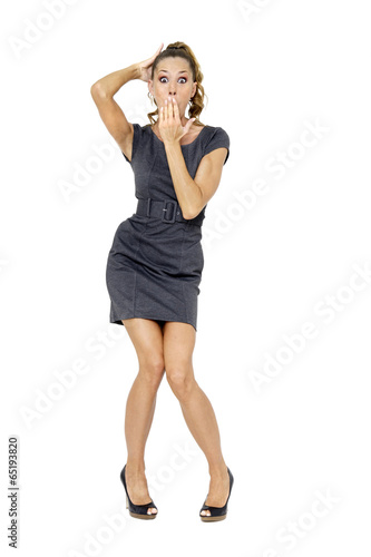 Fototapeta premium Junge Frau im Minikleid , Hand in den Mund