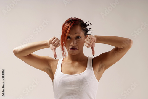 © foto.fritz, Fototapeta premium junge Frau mit weißem Shirt halten beide Daumen nach unten
