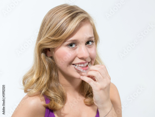 Fototapeta premium Junge Frau setzt lächelnd Zahnspange in den Mund