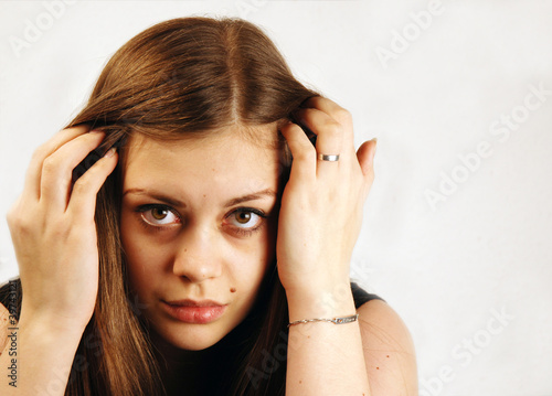 Naklejka premium Junge Frau streicht sich die Haare zur Seite