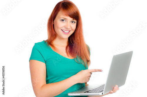 © Racle Fotodesign, Naklejka premium junge frau zeigt auf ihr laptop