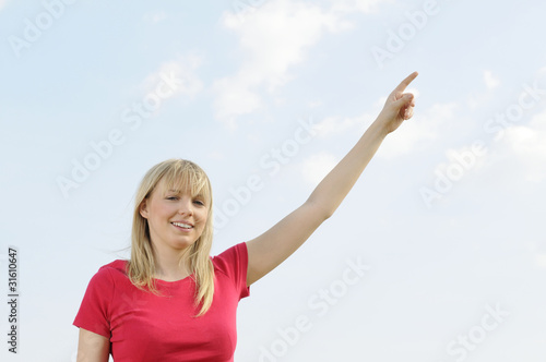© luna, Fototapeta premium junge frau zeigt in den himmel