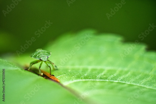 © MichaelSchnell, Fototapeta premium Junge grüne Wanze auf grünem Blatt