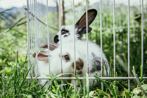 Obraz premium Junge Hasen in Freiluftkäfig, draußen