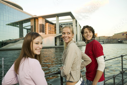 © tunedin, Fototapeta premium Junge Menschen stehen am Geländer