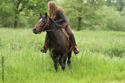 © Petra Eckerl, Obraz premium Junge Reiterin lachend auf Pferd