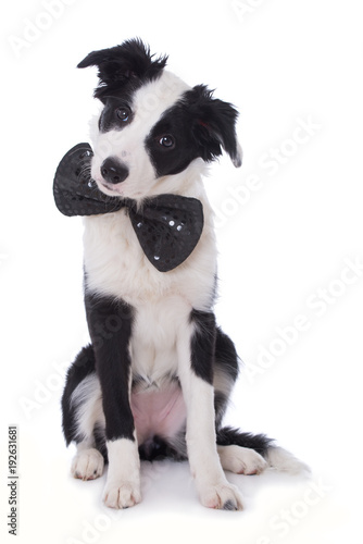 © DoraZett, Fototapeta premium Junger Border Collie mit Fliege isoliert auf weißem Grund