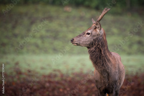 © Nadine Haase, Fototapeta premium Junger Hirsch im Morgengrauen