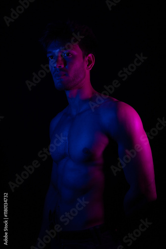 Naklejka premium Junger Mann aus Indien steht mit freiem Oberkörper in buntem Licht und posiert