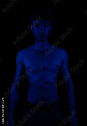 Naklejka premium Junger Mann aus Indien steht mit freiem Oberkörper in buntem Licht und posiert