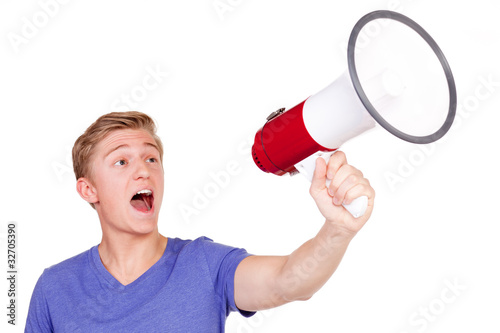 © Racle Fotodesign, Naklejka premium junger mann spricht durch ein megafon