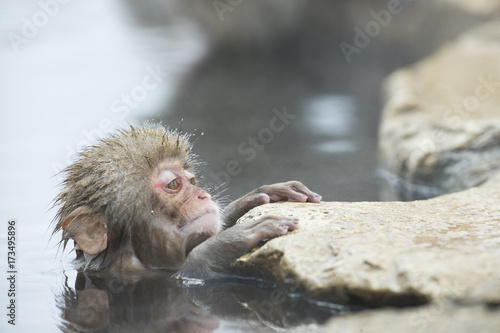 Fototapeta premium Junger Schneeaffe in der Thermalquelle