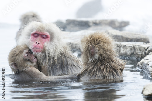 © aussieanouk, Obraz premium Junger Schneeaffe schmiegt sich an das Muttertier