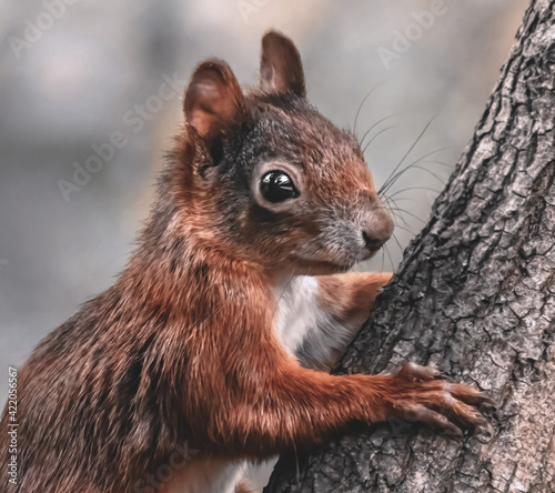 Fototapeta premium Junges Eichhörnchen am Baumstamm