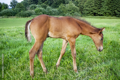 © bidaya, Fototapeta premium Junges Fohlen beim Grasen auf Weide