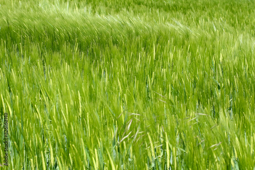 © evbrbe, Obraz premium Junges Grünes Getreide wiegt sich im Wind