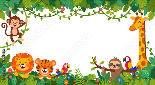 Fototapeta premium Jungle Animals Frame with Happy Monkey, Giraffe, Lion, Tiger, and Sloth