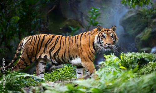 © Darcos, Obraz premium Jungle big tiger wild hunting in the green forest background